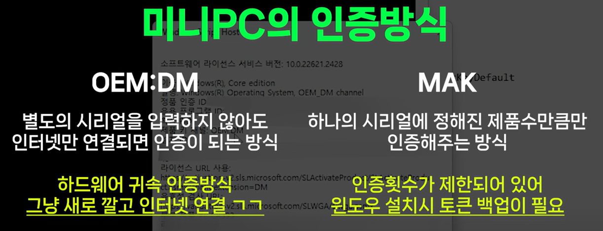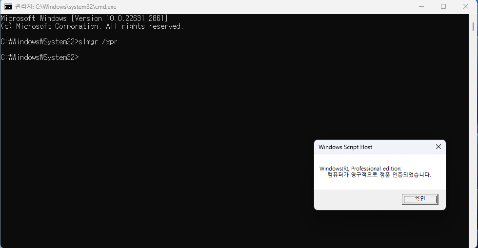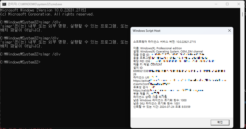 백업한 정품 키 인증 번호를 이용해 cmd에서 다음 명령를 입력